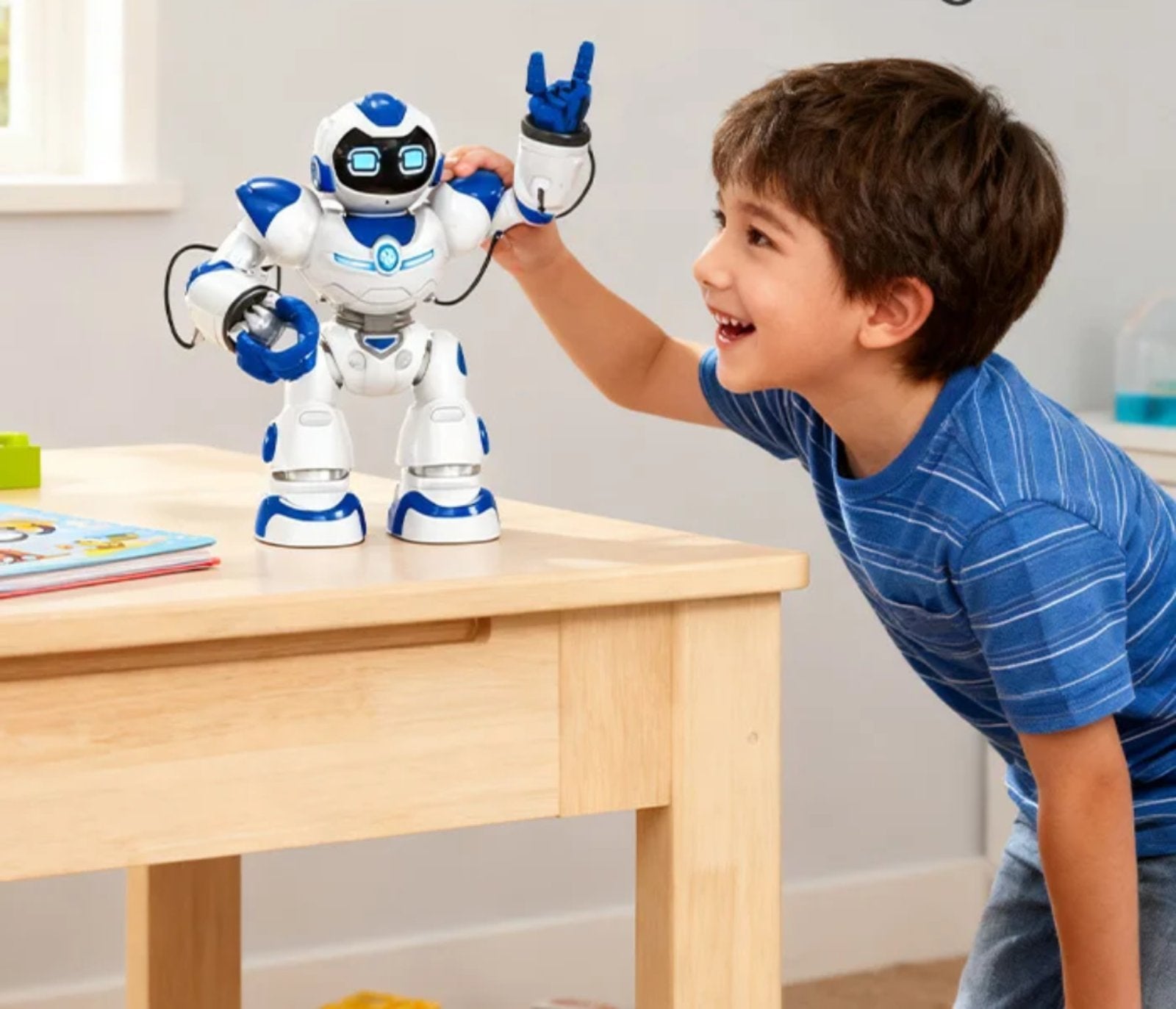 Ovaj Intelligent Robot je interaktivna, multifunkcionalna igračka namenjena deci starijoj od 8 godina. Dizajniran je u kombinaciji bele i plave boje, sa modernim futurističkim izgledom i svetlećim LED elementima koji dodatno naglašavaju njegovu naprednu tehnologiju.